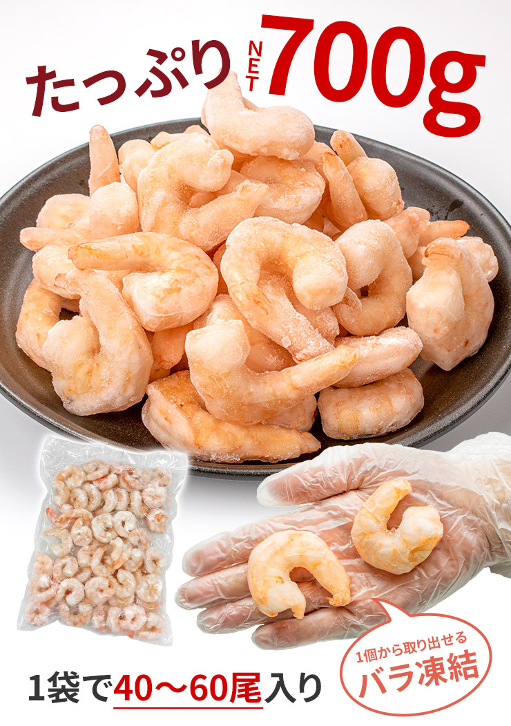 業務用たっぷり700g!殻剥き済で味も絡みやすい。バラ凍結でお料理に使いやすい逸品です。