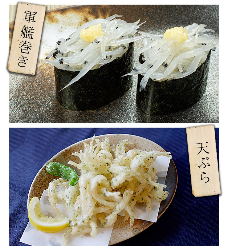 白魚はプリッとした食感で、淡白ながら旨みと程よい苦みが特徴。どんぶり、お寿司、天ぷらやかき揚げなどにどうぞ。