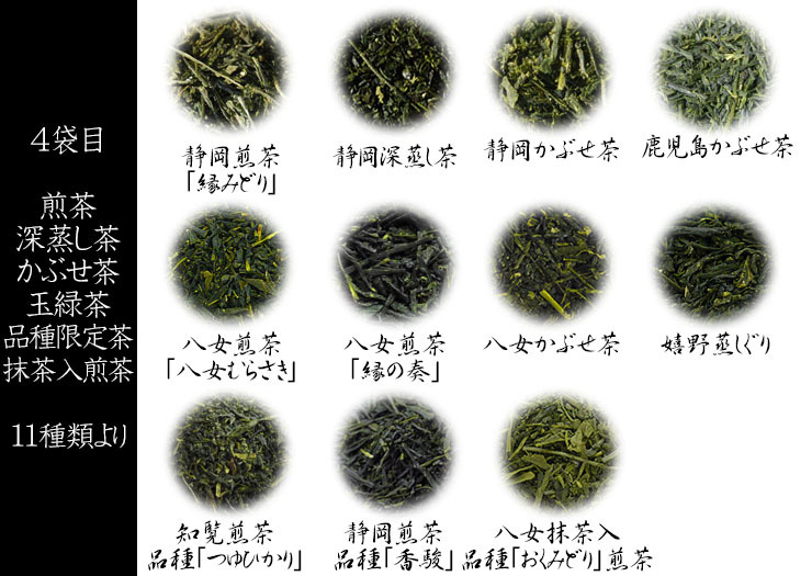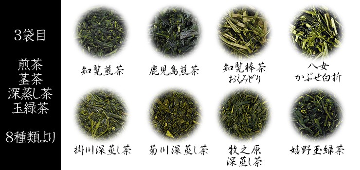 日本茶 選べる茶葉 4袋 (40g〜100g×3袋+60〜70g) 静岡 八女 鹿児島 知覧 嬉野 掛川 菊川 牧之原 煎茶 茎茶 深蒸し かぶせ 品種限定