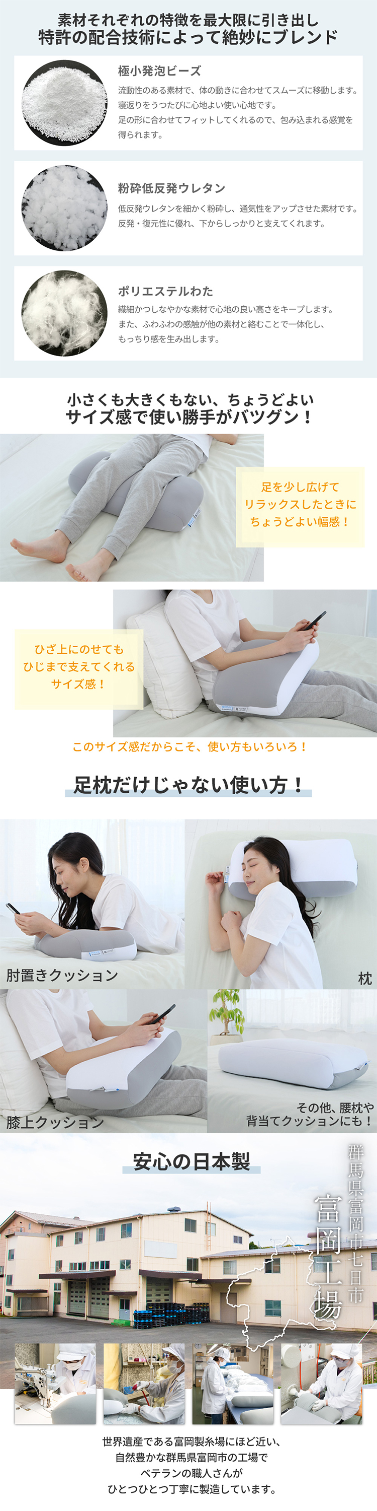 〇足枕としてだけでなく、肘置きクッションや枕、膝上クッションとしても使用できます。