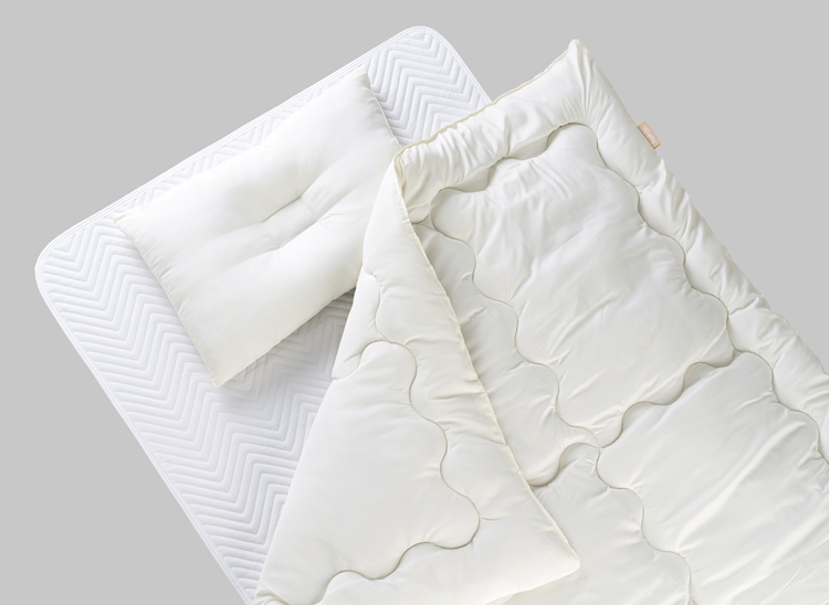 枕はご利用時にフィットしやすいくぼみ枕、布団は通年通して使っていただける合い掛け布団となっています。
