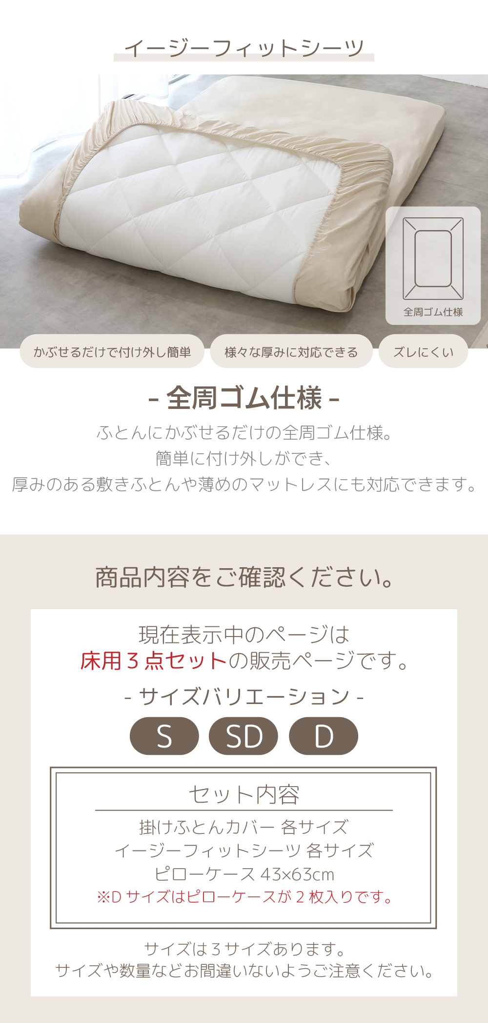 セット内容:ピローケース(ダブルサイズ以上は2枚)/掛けふとんカバー/イージーフィットシーツ
