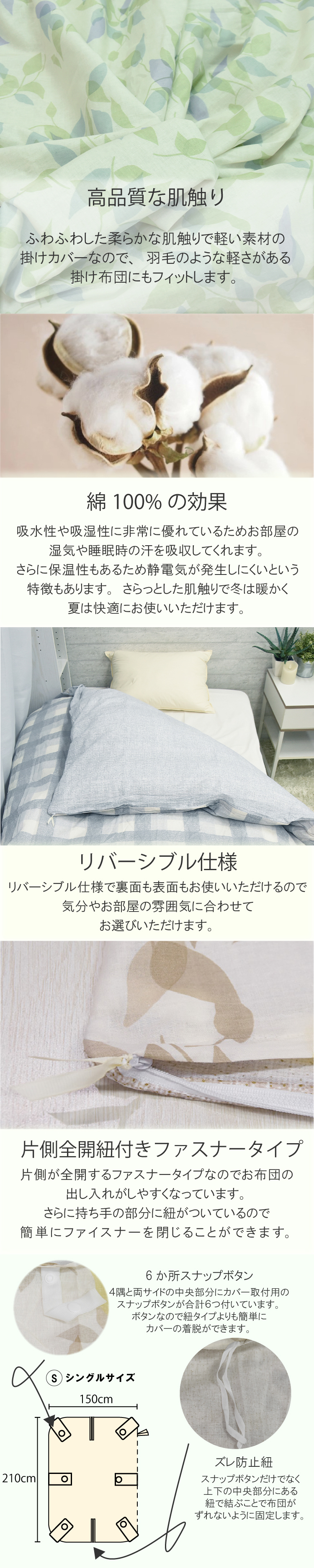 綿100% リバーシブル 掛け布団カバー シングル 片側全開ファスナー ストライプ チェック リーフ 洗濯可能 ウォッシャブル カバー コットン 音部 受発注
