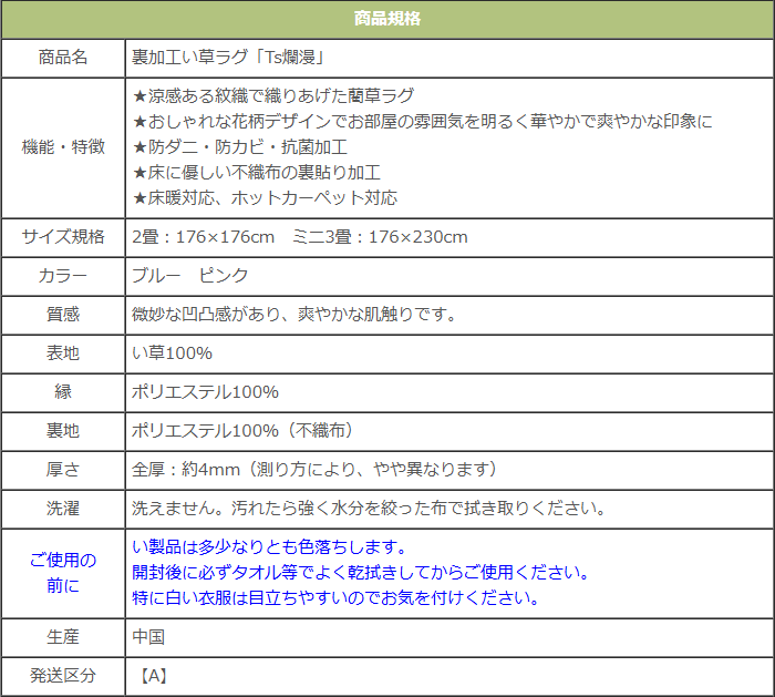 お得 い草 藺草 ござ 花茣蓙 花ござ 花莚 はなむしろ 藺草カーペット い草ラグ い草カーペット カーペット ラグ 敷物 藺草ラグ ラグマット | 花柄 フラワー柄 hana ピンク ブルー 桃色 青 | 裏面加工 天然素材 自然素材 防ダニ 防カビ 抗菌 裏張り 裏加工 不織布 不織布貼り 不織布加工 防ダニ加工 抗菌加工 防カビ加工 防臭加工 ホットカーペット対応 床暖対応 洗濯不可 | リビング インテリア おしゃれ お洒落 モダン かわいい 大人 洋風 フェミニン 華やか クール | 2畳 3畳 176×176cm 176×230cm 長方形 正方形 | 春夏秋冬 夏 サマー summer 爽やか 爽涼 春用 夏用 清々しい 春ラグ 夏ラグ 夏敷物 春敷物 | 【九州/北海道/沖縄追加送料有】 四国と本州は送料無料 アイコン