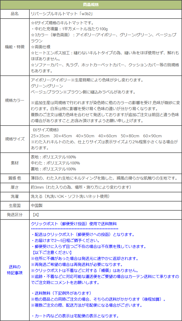☆3色規格:アイボリー/アイボリー(単色両面)、グリーン/グリーン(単色両面)、ベージュ/ブラウン(2色両面)