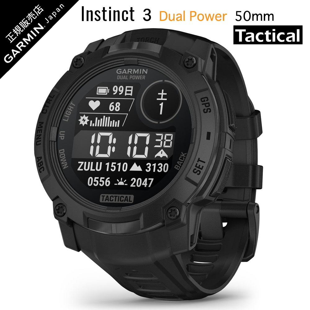 「Follow Yours.」自分の道を突き進め。Instinct(インスティンクト) 3はあらゆる場所で身に着けられるタフネスGPSスマートウォッチです。GPSやコンパスでアウトドアを楽しんだり、通知機能や健康管理機能で日常をスマートに過ごしたり。直感を信じ、自分の道を進むあなたの相棒となります。Dual Powerモデルはソーラー充電により超ロングバッテリーを実現したモデルです。 【Dual Power モデル】ソーラー充電により、無限の超ロングバッテリーを実現できるモデルです。アメリカ国防総省による品質基準「MIL-STD-810」に準拠した、どんな状況にも耐えうるタフネスGPSウォッチ。 【金属強化】ベゼル一部に金属を使用し、強度を高め、高級感のあるデザイン。 【タッチ決済】便利なSuica機能を搭載。 【稼働時間】50,000ルクスの条件下で3時間以上着用している場合、無制限のロングバッテリー/ソーラー充電無しで約28日間稼働 【サイズ】50 x 50 x 14.4 mm 【手首周り適応サイズ】141-213 mm 【重量】58g 【通知機能】互換性のあるスマートフォンとペアリングすれば、ウォッチで電子メールやテキスト、アプリの通知を受信できます。 【LEDフラッシュライト】赤と白のLEDフラッシュライトを搭載し、暗い場所でも安心して行動できます。 【健康モニタリング】心拍数、睡眠モニタリング、ストレスレベルなど、日常生活やアクティビティ中の健康をモニタリングできます。 【マルチスポーツ機能】ランニング、ウォーキング、バイク、登山、水泳、スキー、サーフィンなど、豊富なアクティビティプロフィールが搭載されています。