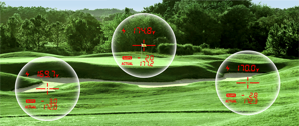 複数のレーザー反射情報から最も近くの目標物情報を優先的に処理するモードです。 ピンより奥の目標物に照準を合わせ、電源ボタンを押しながらピンに合わせると、ロックアイコンが表示され、本体が振動し距離が固定されます。