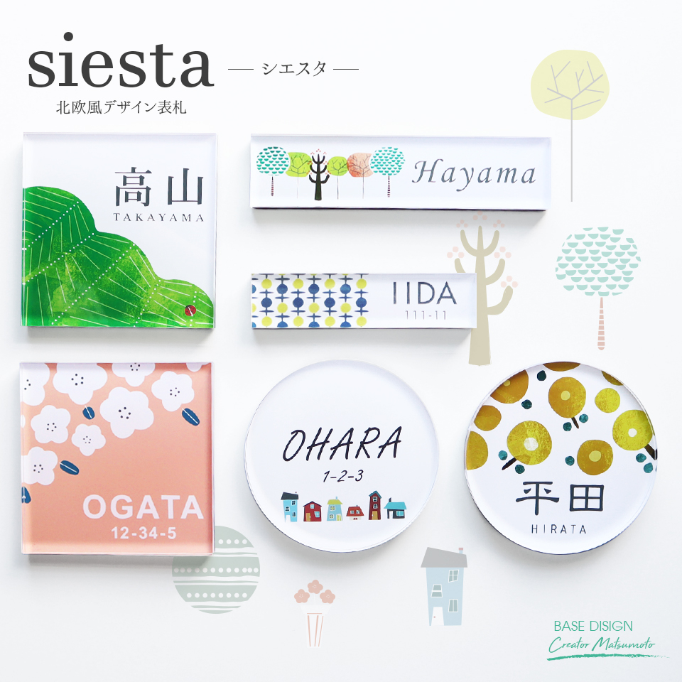| まるでカフェの看板のような、北欧風の柄が人気のアクリルネームプレート。 長方形・正方形・丸形の3種類の形状から選べるので、お好みのデザインの表札が作れます。 取り付け時は、シールやタイルのようにぺたっと貼るだけ。 店舗やオフィスの看板にもお使いいただけますよ。 |