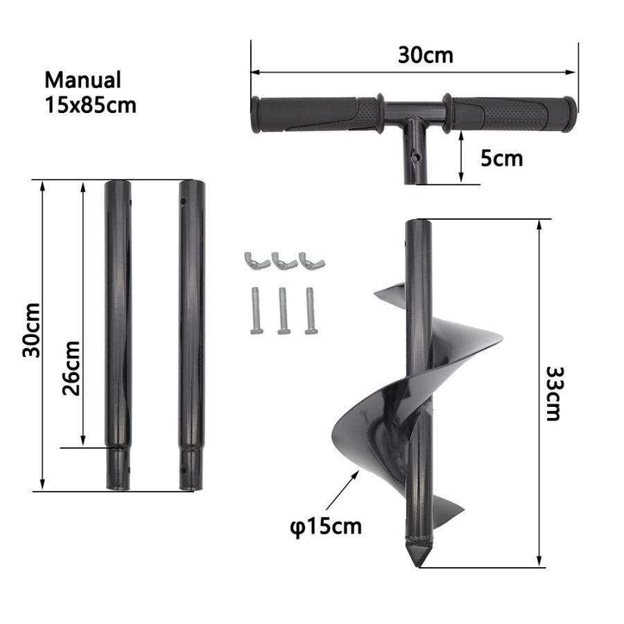 【T字型手動ドリルビット】この手動式アースドリル は4つの仕様があります。(長さ85cm、直径15cm / 長さ85cm、直径20cm)。3ステップ/4ステップ接続構造を持ち、幅広いグリップはゴム袖で接続されています。ゴム袖の表面のテクスチャデザインにより、より優れたグリップ力を提供します。