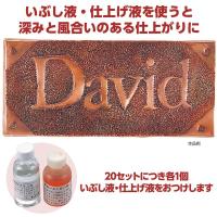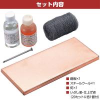 釘でたたき出し、いぶし液をかければ、すばらしい表札ができあがります。0.2mmのなまし銅板を12mmのベニヤに巻いた完成品です。側面ビスどめ銅板×1、スチールウール×1、釘×1ご注文20コにつき仕上げ液といぶし液を各1本サービス!200×90×9mm