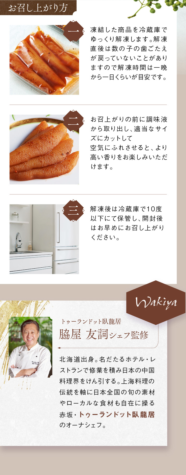 中国内陸の四川省の代表的な味覚「麻辣」と海の幸数の子の不思議な出会いが 実現しました。Wakiyaが使用している3年間熟成させた豆板醤に山椒の香りを 加え、中国料理の巨匠 脇屋友詞が自信をもってお届けする麻と辣の辛みの競 演をお楽しみいただきます。姉妹商品「黄金XO醤数の子」と食べ比べていた だくと脇屋友詞の世界をさらにお楽しみいただけます