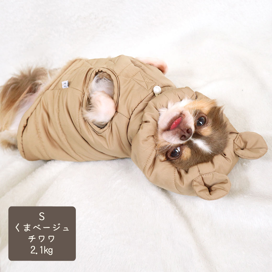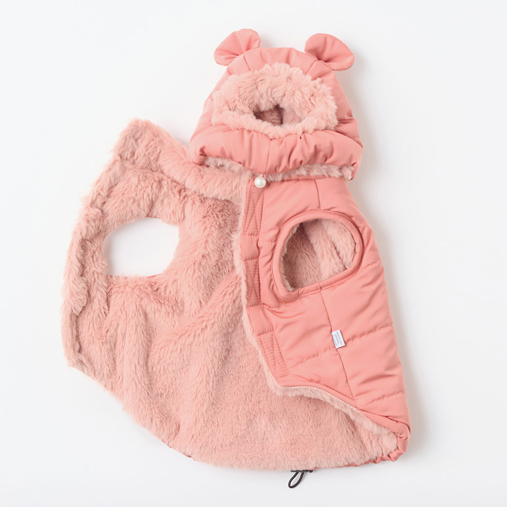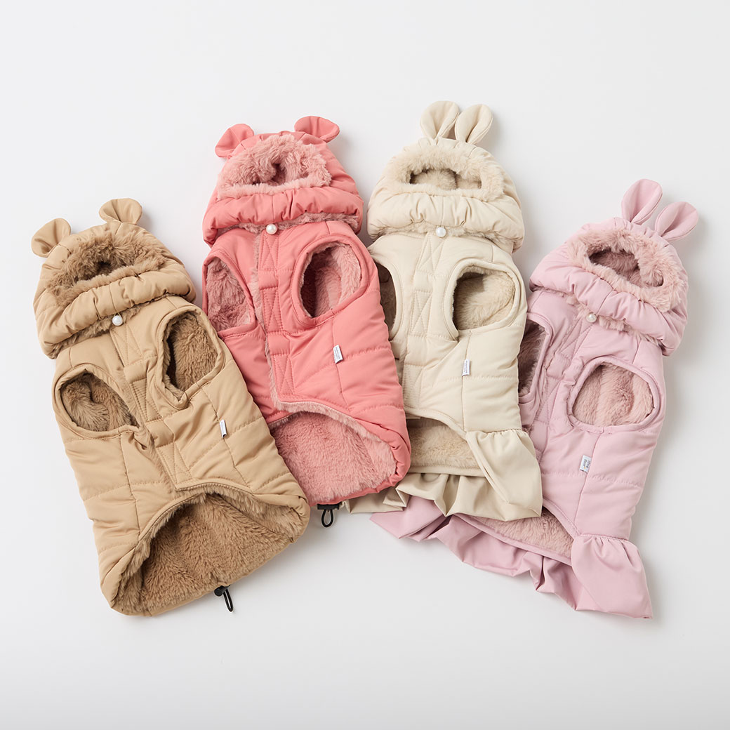 くま耳・うさ耳付きのかわいい犬用ダウンコート。フードを取り外すことができるセパレートタイプ。