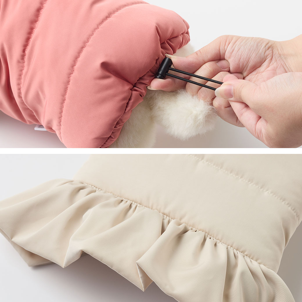 中綿入りの暖かくてかわいい愛犬用ダウン風コートです。撥水加工がしてあるので、小雨や雪の日にもオススメです。