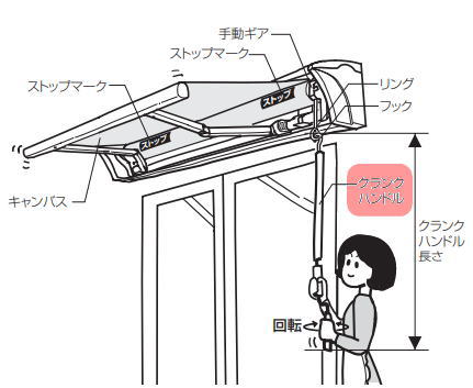 クランクハンドルのフックを手動ギアのリングに引っ掛け、手回しで開閉します。