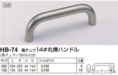 シロクマ 白熊印 HB-74 真鍮14φ丸棒ハンドル 引き出し、家具用取手 取っ手 120mmビスピッチ