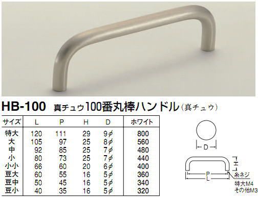 シロクマ 白熊印 HB-100 真鍮100番丸棒ハンドル 豆大 55mmビスピッチ (M3糸ネジ) 引き出し、家具用取手 取っ手