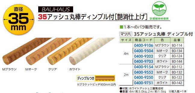 マツ六 35 アッシュ丸棒ディンプル付 手すり BD-142 ホワイト 2m ※直送/代引不可/沖縄・離島配送不可