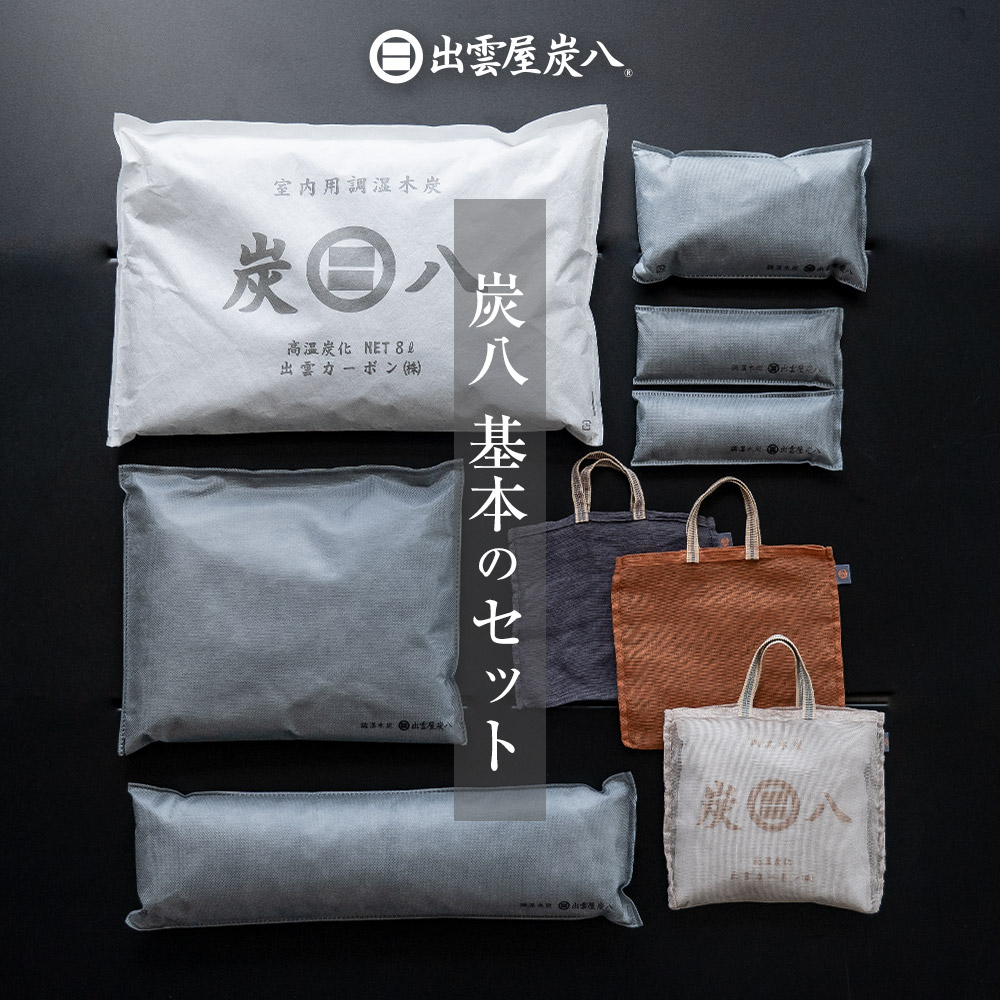 ▲住まいをカラッと心地よく「出雲生まれの炭八」イエノLabo.が自信を持ってお届けする、炭八ほぼ全サイズ&かや袋が各1点ずつ入った「基本のセット」