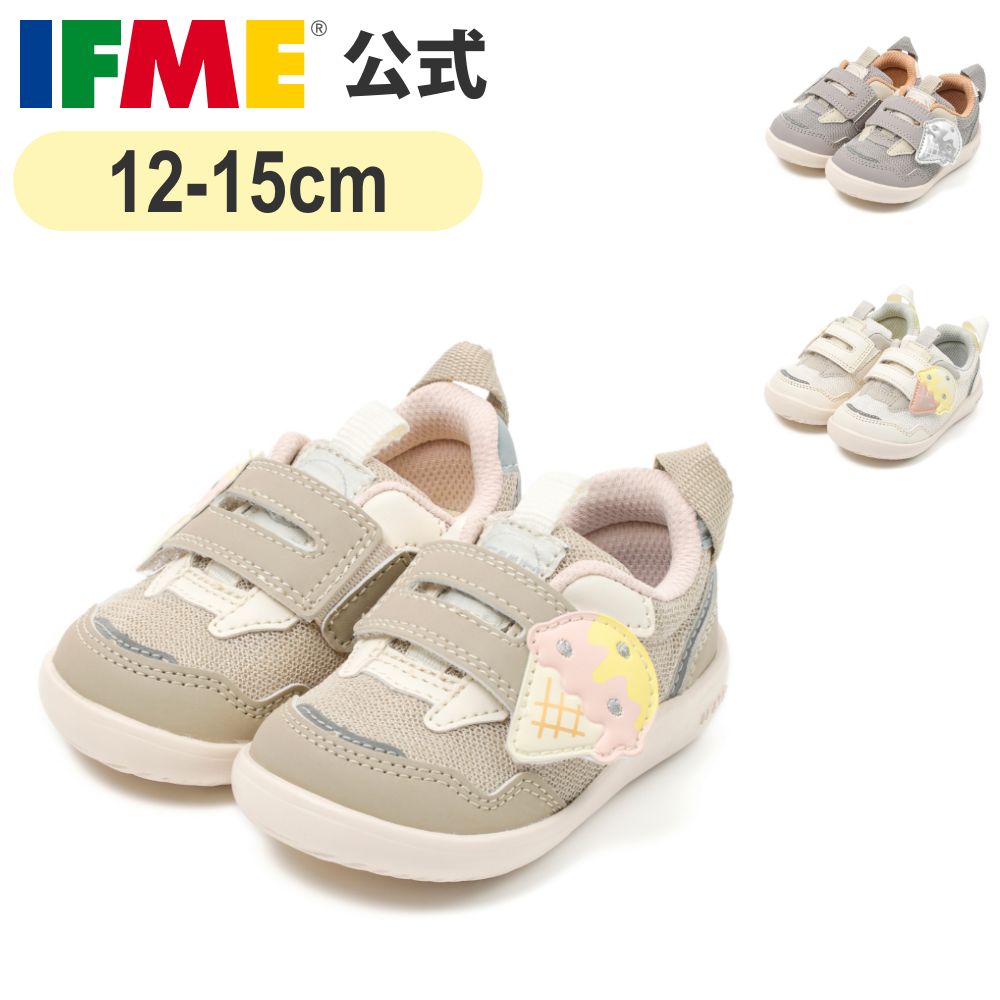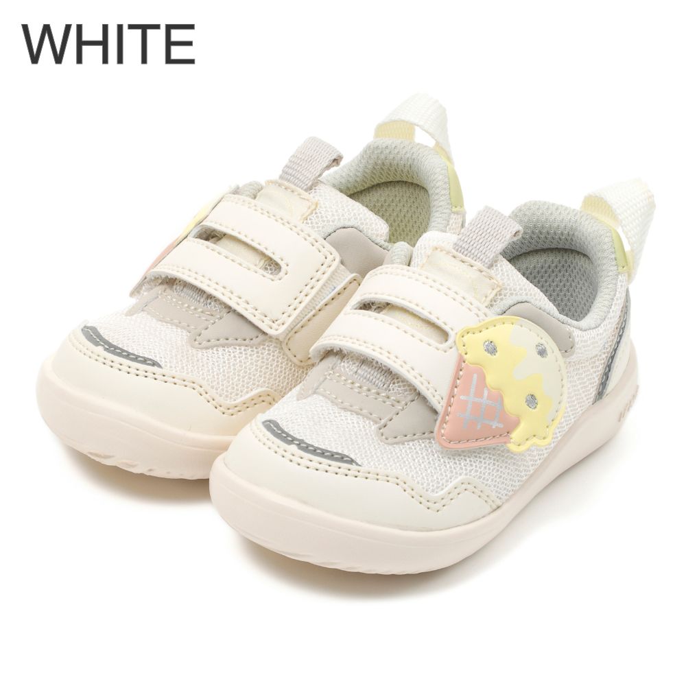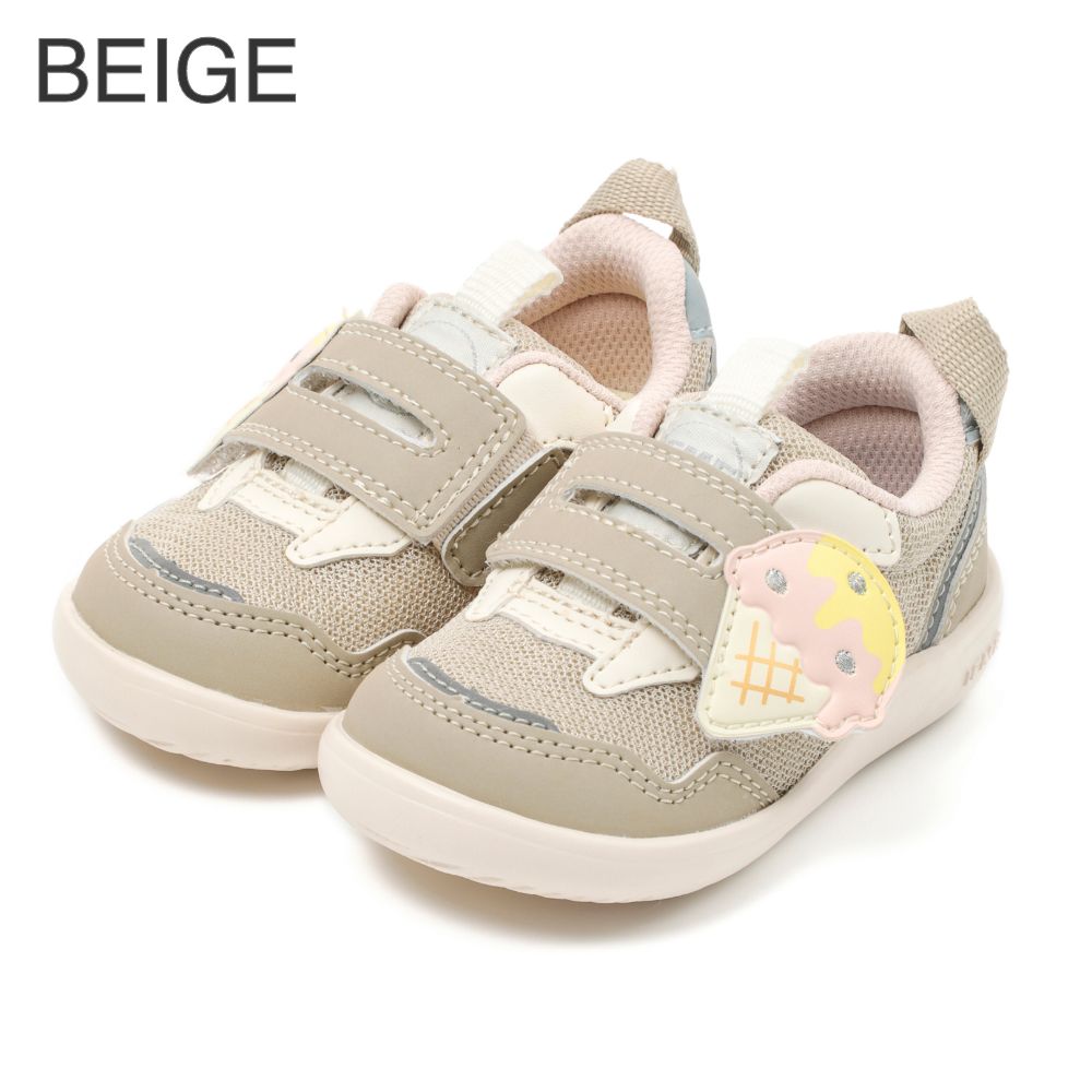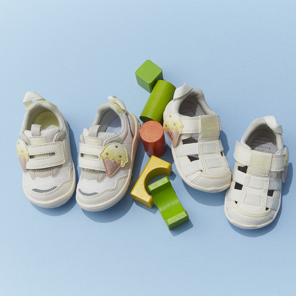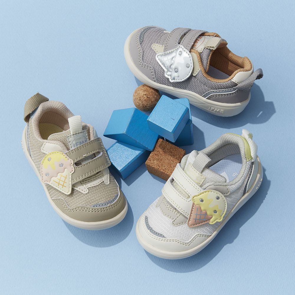 定番のワンベルトタイプスニーカーより、アイスクリームをモチーフにした夏らしいシューズが登場。落ち着きのあるアースカラーに可愛いモチーフが目を引くアイテムです。