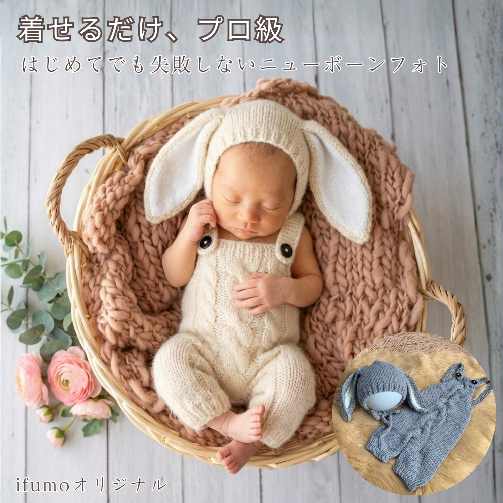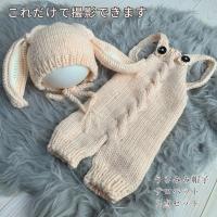 ニューボーンフォト セルフ コスチューム うさぎ 帽子 サロペット セット ベビー うさ耳ニット 新生児 男の子 女の子 ニューボンフォト おうちフォト