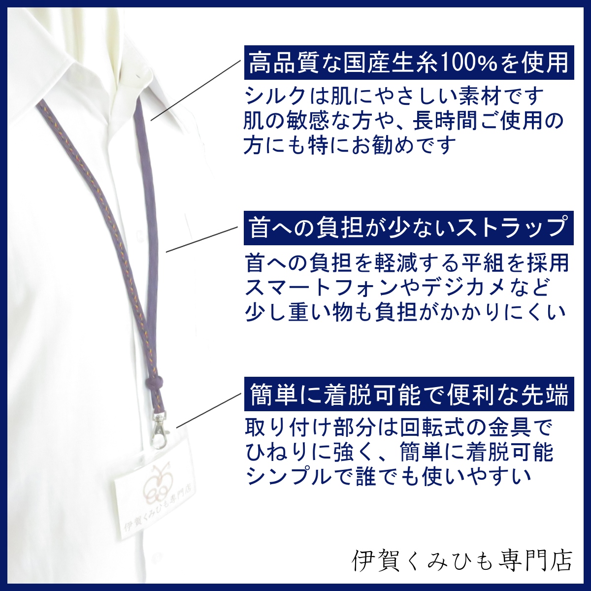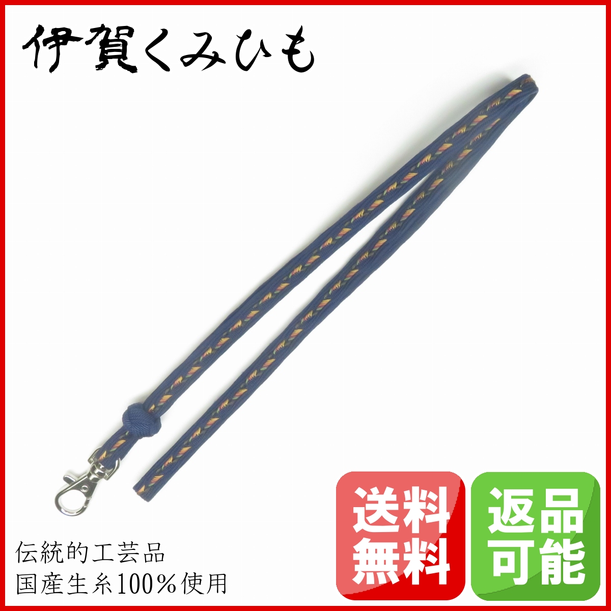 ネックストラップ綾高雲船(濃紺) 絹100% スマホ 伊賀くみひも メンズ レディース おしゃれ 正絹