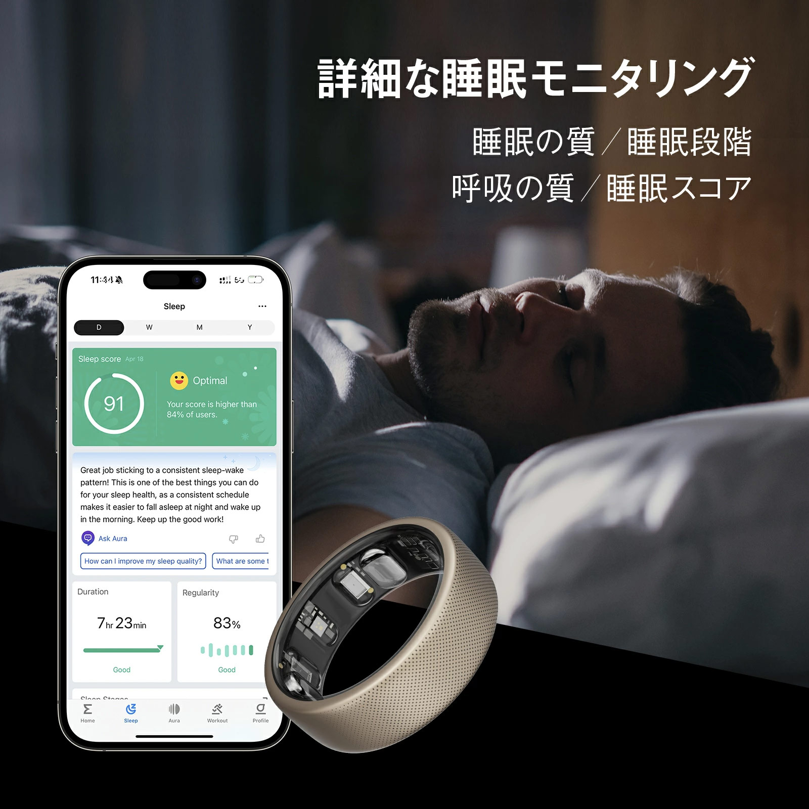 ■睡眠の質のモニタリング:睡眠段階(REMを含む) 昼寝の時間、睡眠時の呼吸の質、睡眠スコア、Zepp Aura
