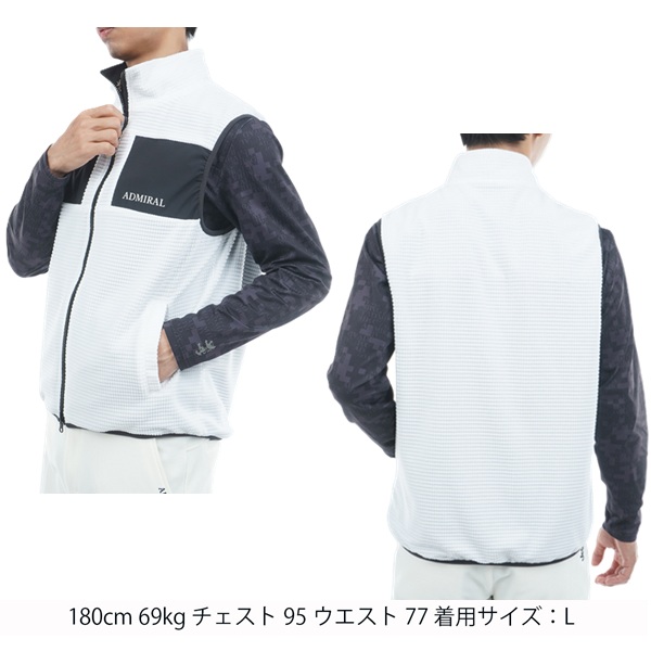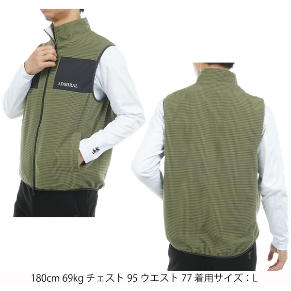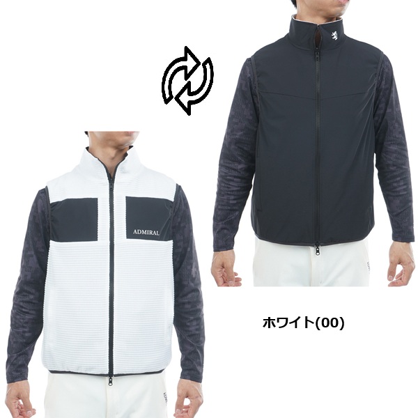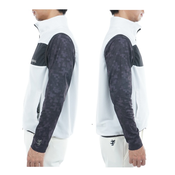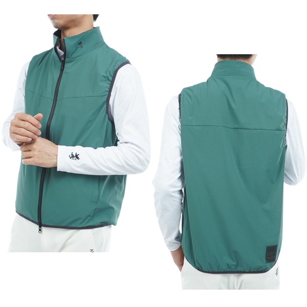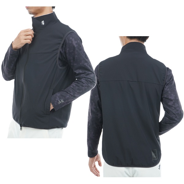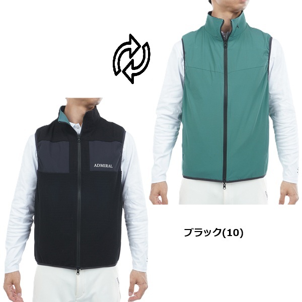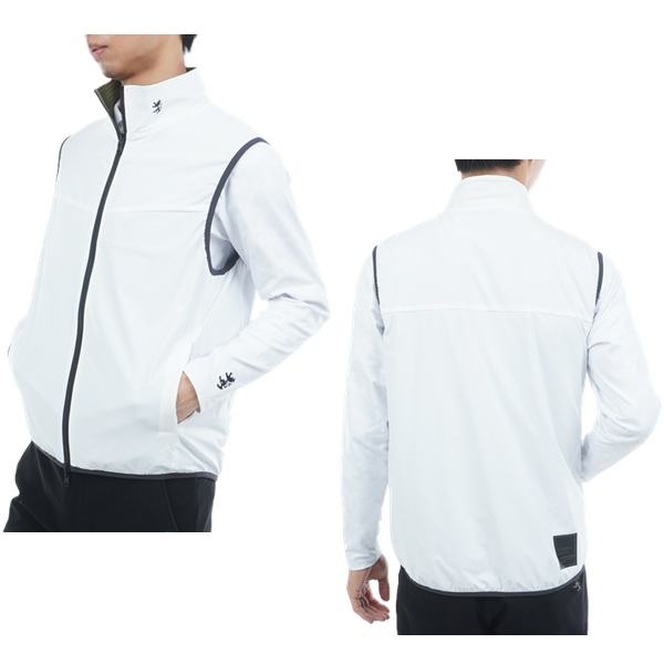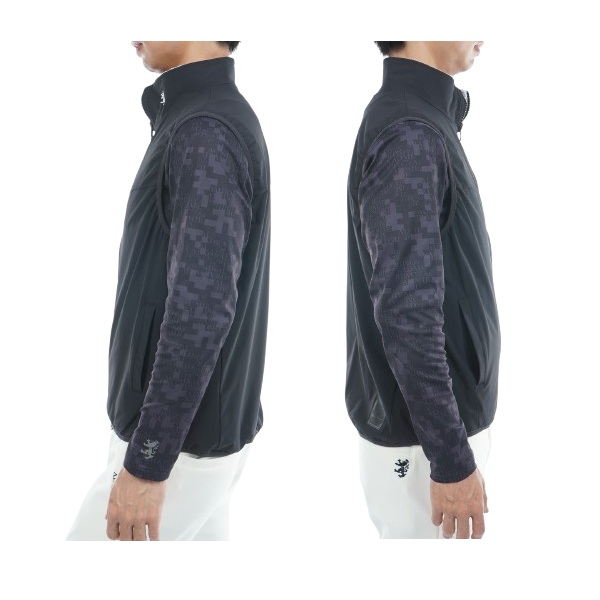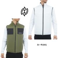 フリース素材と、ストレッチタフタのリバーシブルベスト。表面は保温性に優れたフリース素材を使用し、胸元の切替デザインが特徴です。