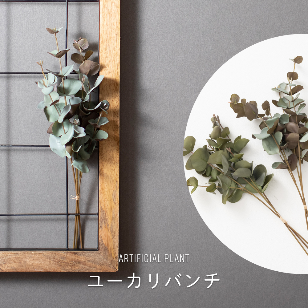 | ■商品名 ユーカリバンチ(1束3本) ■カラー セージグリーン、グレイグリーン ■サイズ 長さ40cm、葉径2〜5cm ■材質 ポリエチレン・EVA樹脂 |