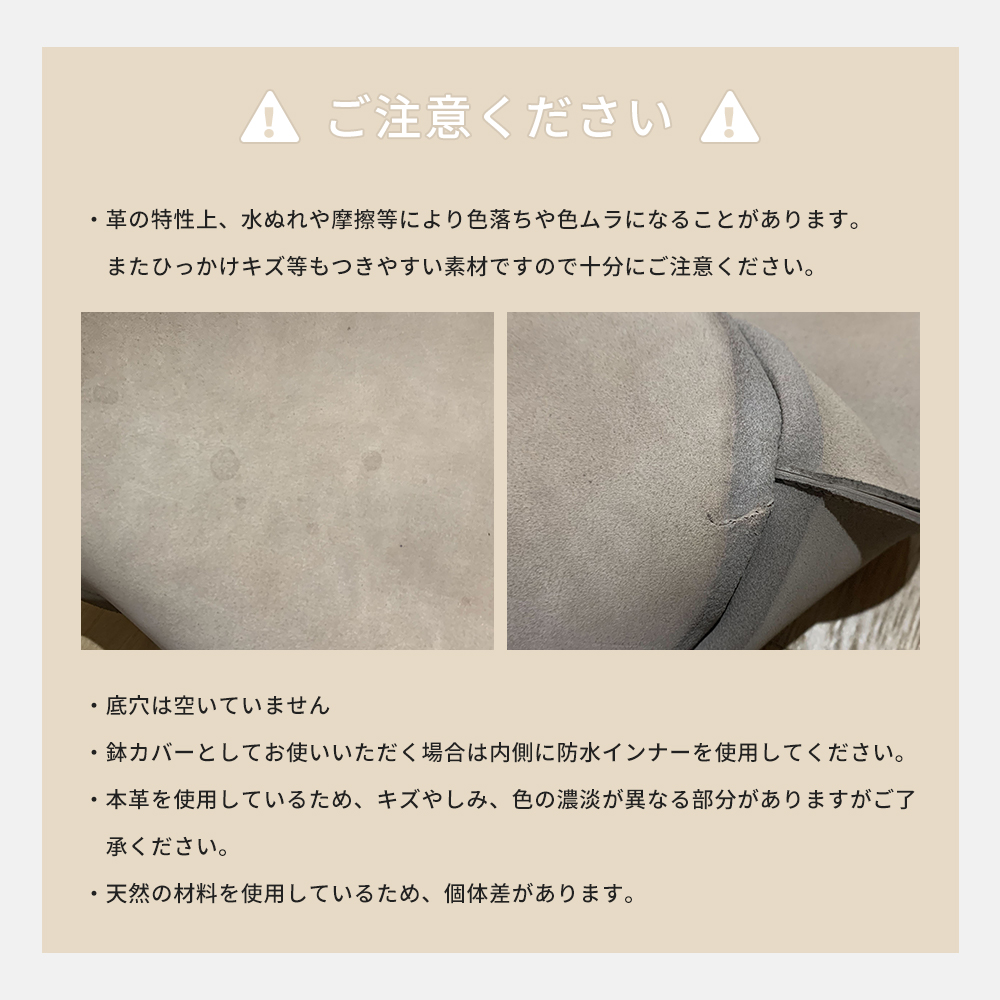 | ・革の特性上、水ぬれや摩擦等により色落ちや色ムラになることがあります。またひっかけキズ等もつきやすい素材ですので十分にご注意ください。 ・底穴は空いていません。 ・鉢カバーとしてお使いいただく場合は内側に防水インナーを使用してください。 ・本革を使用しているため、キズやしみ、色の濃淡が異なる部分がありますがご了承ください。 ・天然の材料を使用しているため、個体差があります。 |