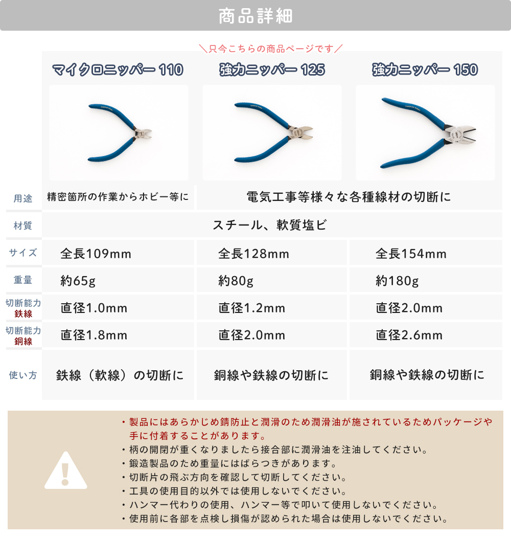 | ・電流が流れているものには使用しないでください。グリップに絶縁機能はありません。 ・製品にはあらかじめ錆防止と潤滑のため潤滑油が施されているためパッケージや手に付着することがあります。 ・柄の開閉が重くなりましたら接合部に潤滑油を注油してください。 ・鍛造製品のため重量にはばらつきがあります。 ・切断片の飛ぶ方向を確認して切断してください。 ・工具の使用目的以外では使用しないでください。 ・ハンマー代わりの使用、ハンマー等で叩いて使用しないでください。 ・使用前に各部を点検し損傷が認められた場合は使用しないでください。 ・切断能力を超えた線材は切断しないでください。 ・ピアノ線の切断はできません。 |