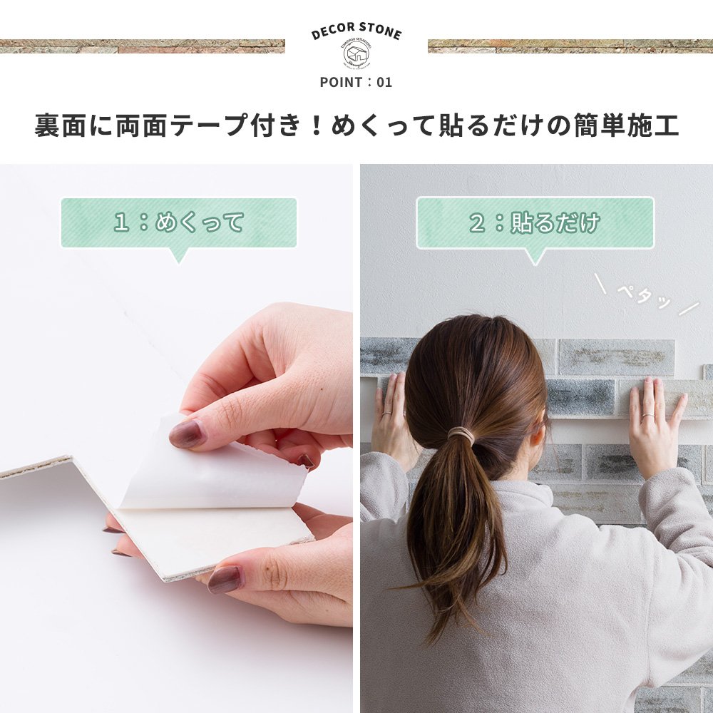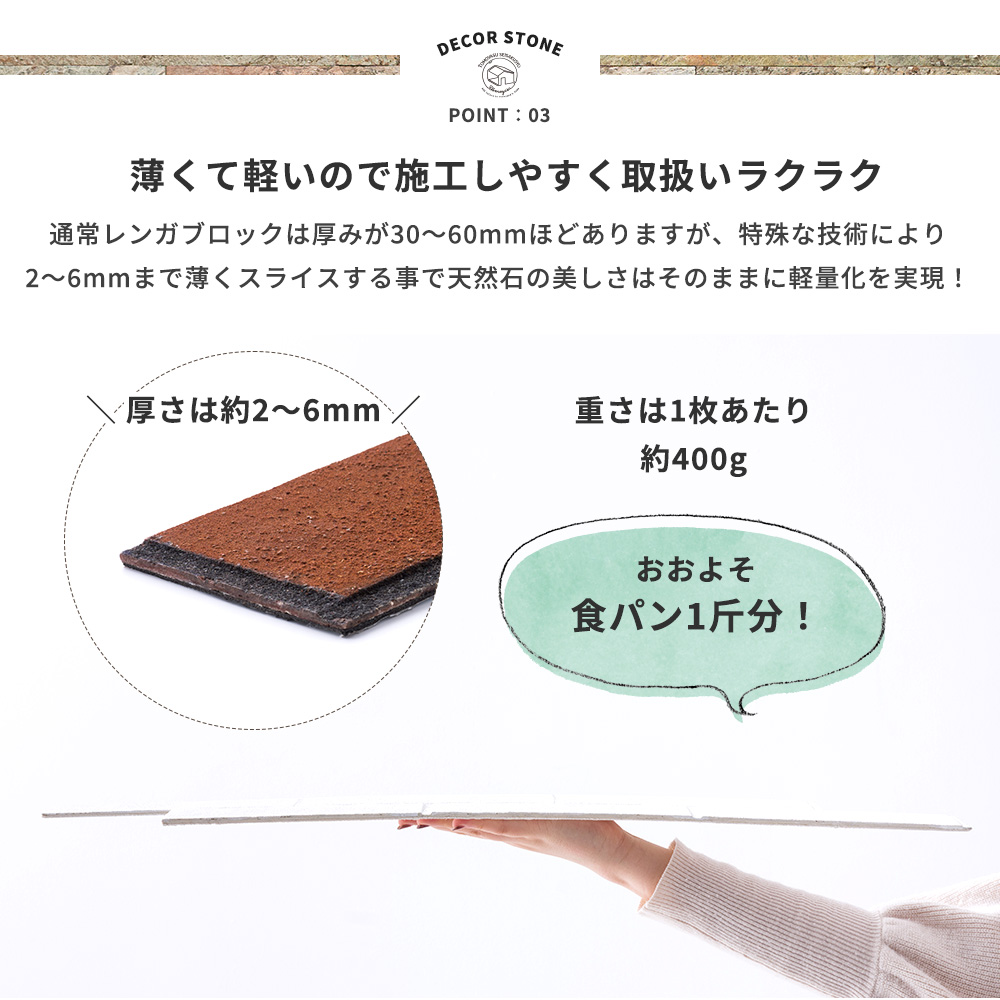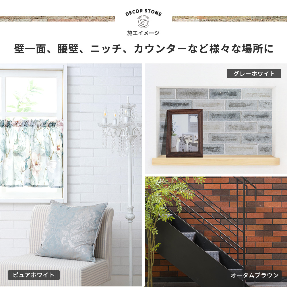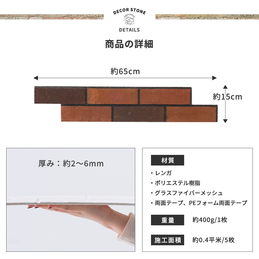 | ■商品名 デコストーン RETRO BRICK(レトロブリック) ■枚数 1ケース(5枚入り) ■材質 レンガ、ポリエステル樹脂、グラスファイバーメッシュ、両面テープ、PEフォーム両面テープ ■カラー ピュアホワイト、グレーホワイト、グレー、ベージュ、オータムブラウン ■サイズ 約12.5×65cm、厚み2〜6mm ■重量 約400g(1枚あたり)、約2.5kg(1ケース) ■施工面積 約0.4平米 ■保証 ![]() |