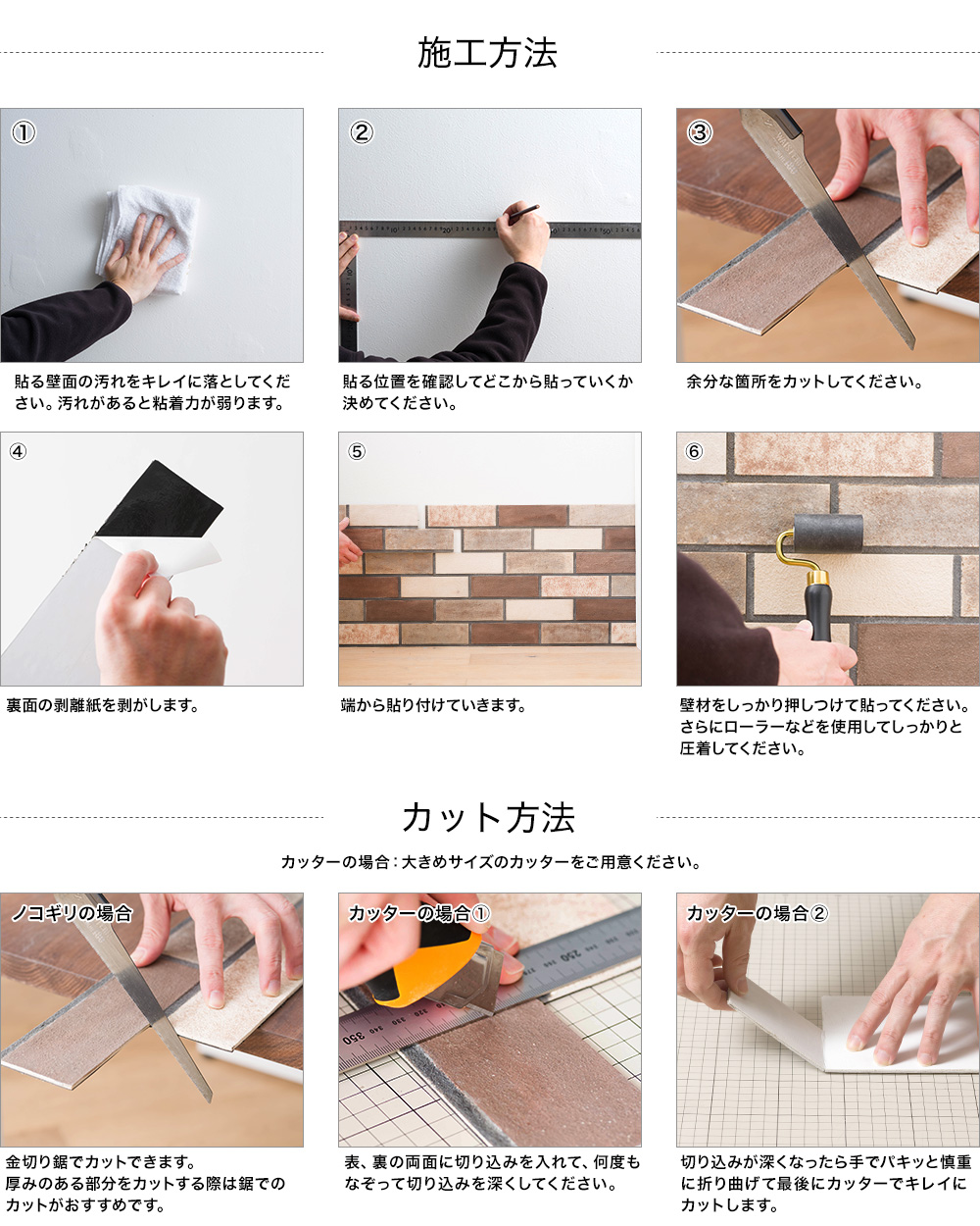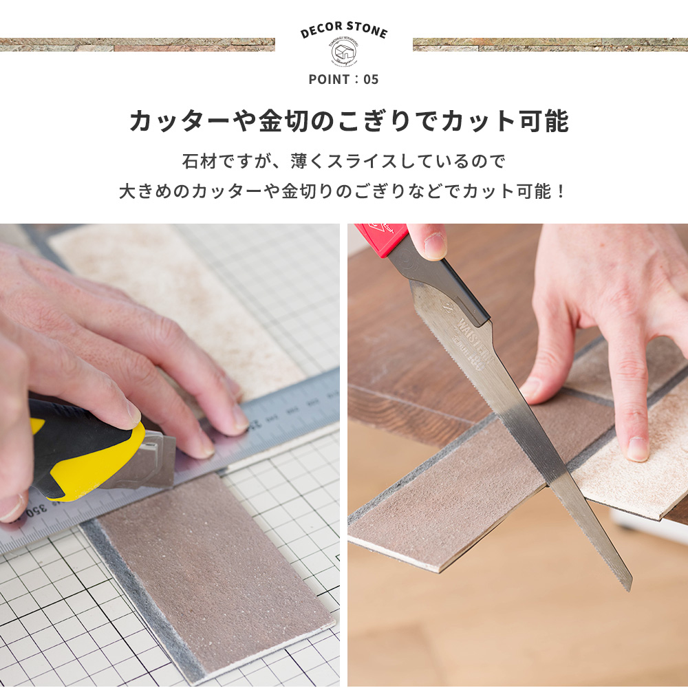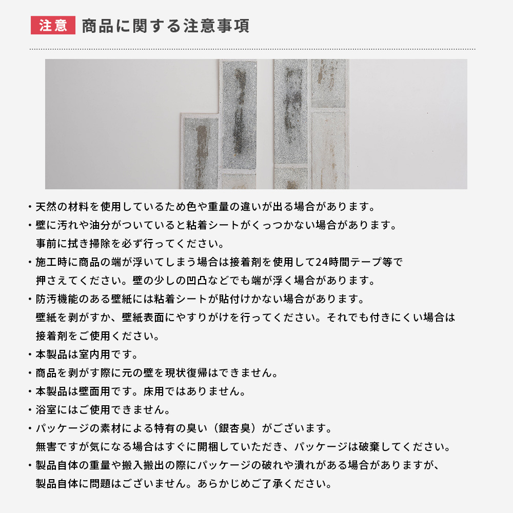 | ・壁に汚れや油分がついていると粘着シートがくっつかない場合があります。事前に拭き掃除を必ず行ってください。 ・施工時に商品の端が浮いてしまう場合は接着剤を使用して24時間テープ等で押さえてください。壁の少しの凹凸などでも端が浮く場合があります。 ・防汚機能のある壁紙には粘着シートが貼付けかない場合があります。壁紙を剥がすか、壁紙表面にやすりがけを行ってください。それでも付きにくい場合は接着剤をご使用ください。 ・本製品は室内用です。 ・商品を剥がす際に元の壁の現状復帰はできません。 ・本製品は壁面用です。床用ではありません。 ・浴室にはご使用できません。 ・天然の材料を使用しているため色や重量、柄の違いが出る場合があります。 ・パッケージの素材による特有の臭い(銀杏臭)がございます。無害ですが気になる場合はすぐに開梱していただき、パッケージは破棄してください。 ・製造過程で行うカットによる粉塵が製品やパッケージに付着しています。ご使用の際は手袋などを装着することをおすすめします。 ・製品自体の重量や搬入搬出の際にパッケージの破れや潰れがある場合がありますが、製品自体に問題はございません。あらかじめご了承ください。 |