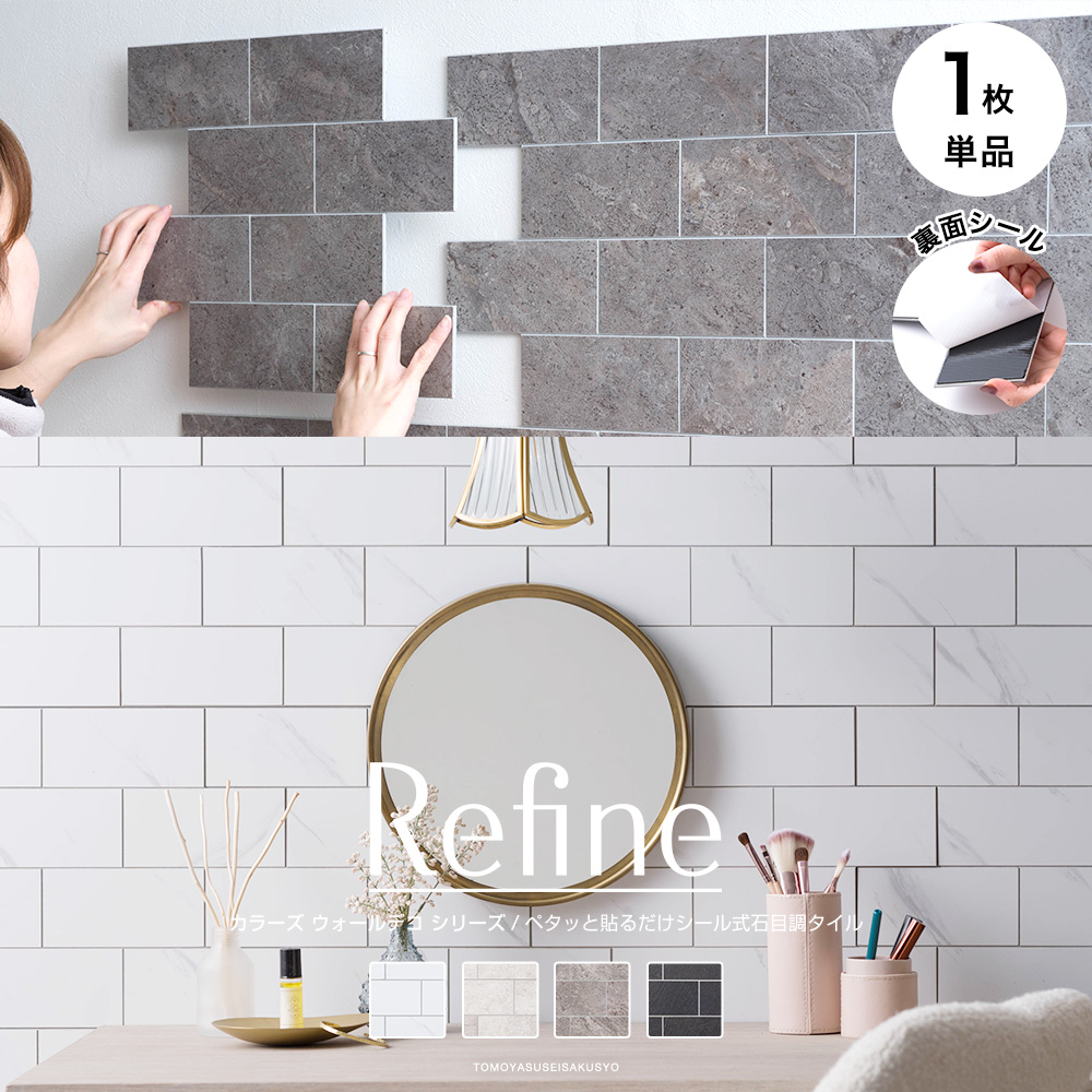 裏面シールの剥離紙を剥がせばそのまま貼る事ができる壁用パネルです。天然石パウダーを主原料とした硬質な素材を使用したリアルなシート。通常天然石のブロックは厚みが10〜20mmほどありますが、リファインは厚さ4mm。薄くすることにより、両面テープでも貼れるほど軽量化されているので女性でも簡単に施工出来るDIYアイテムです。表面にはわずかな凹凸や光沢がありリアルな石目が表現され、薄いシート状には見えない重厚感のある仕上がりになります。