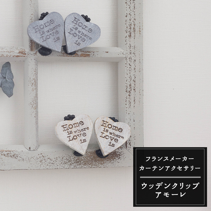 「Home is where Love is」のメッセージがおしゃれなハート型カーテンクリップ。シャビーなインテリアにおすすめの木製クリップです。