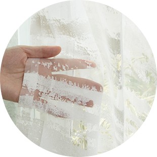 外からの光を受けて輝くようなホワイト生地とオパールプリントの透明感が絶妙でとても美しいレースカーテンです。