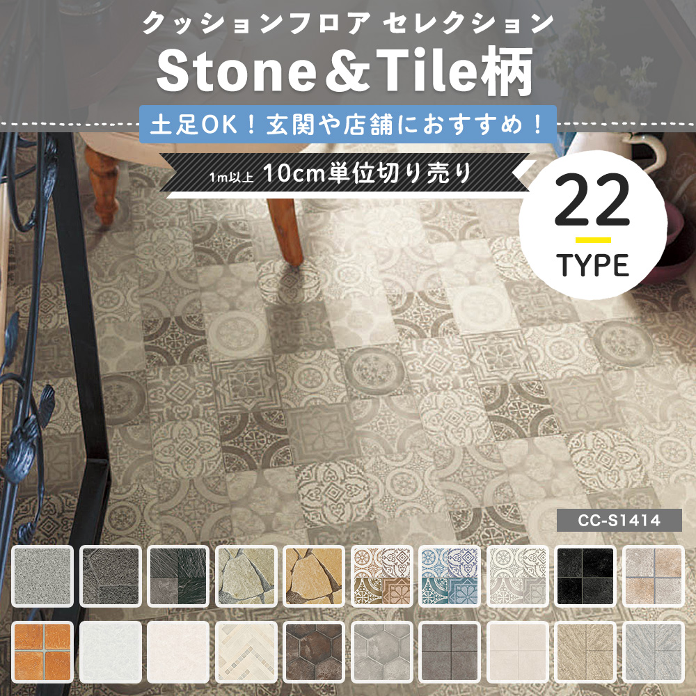 | ■商品名:クッションフロアシート セレクション 土足OK!玄関や店舗におすすめStone&Tile ■サイズ 幅182cm(一部180cm)×長さ1m以上(10cm単位) ■1巻の最長サイズ 20m/巻 ■機能性 耐摩耗/抗ウイルス/抗菌/防カビ/耐次亜塩素酸 ■素材 表面:塩化ビニール 裏:ビニールまたは不織布 ■生産国 日本 |