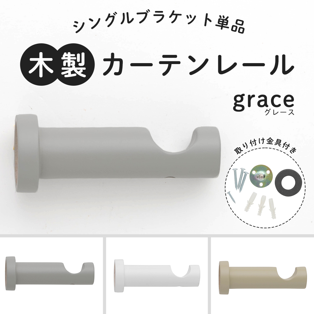 天然木を使ったおしゃれな木製カーテンレール「グレース grace」用のシングルブラケットです。 こちらの「グレース grace」シリーズは、インテリアに合わせやすいカラー塗装を施した木製カーテンレールです。 →「グレース grace」シリーズ一覧はこちら 木目を活かしたナチュラルな木製カーテンレール「モッカ mocca」シリーズも別途販売中! →「モッカ mocca」シリーズは一覧こちら |