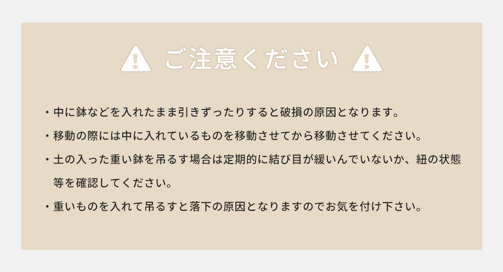 | ・中には鉢などを入れたまま引きずったりすると破損の原因となります。 ・移動の際には中に入れているものを移動させてから移動させてください。 ・ハンキングの商品は土の入った思い鉢を吊るす場合は定期的に結び目が緩いんでいないか、紐の状態等を確認してください。 ・重いものを入れて吊るすと落下の原因となりますのでお気を付け下さい。 |