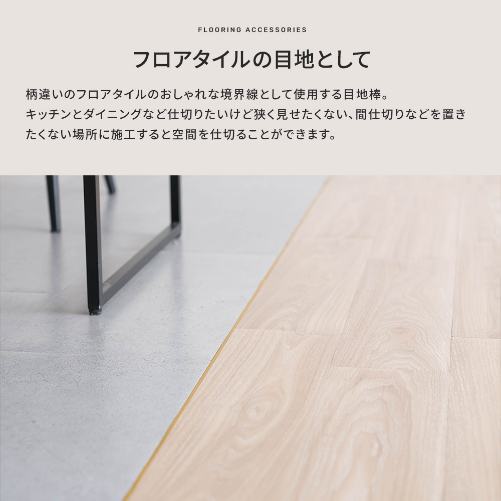 柄違いのフロアタイルのおしゃれな境界線として使用する目地棒。キッチンとダイニングなど仕切りたいけど狭く見せたくない、間仕切りなどを置きたくない場所に施工すると空間を仕切ることができます。