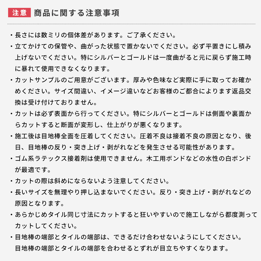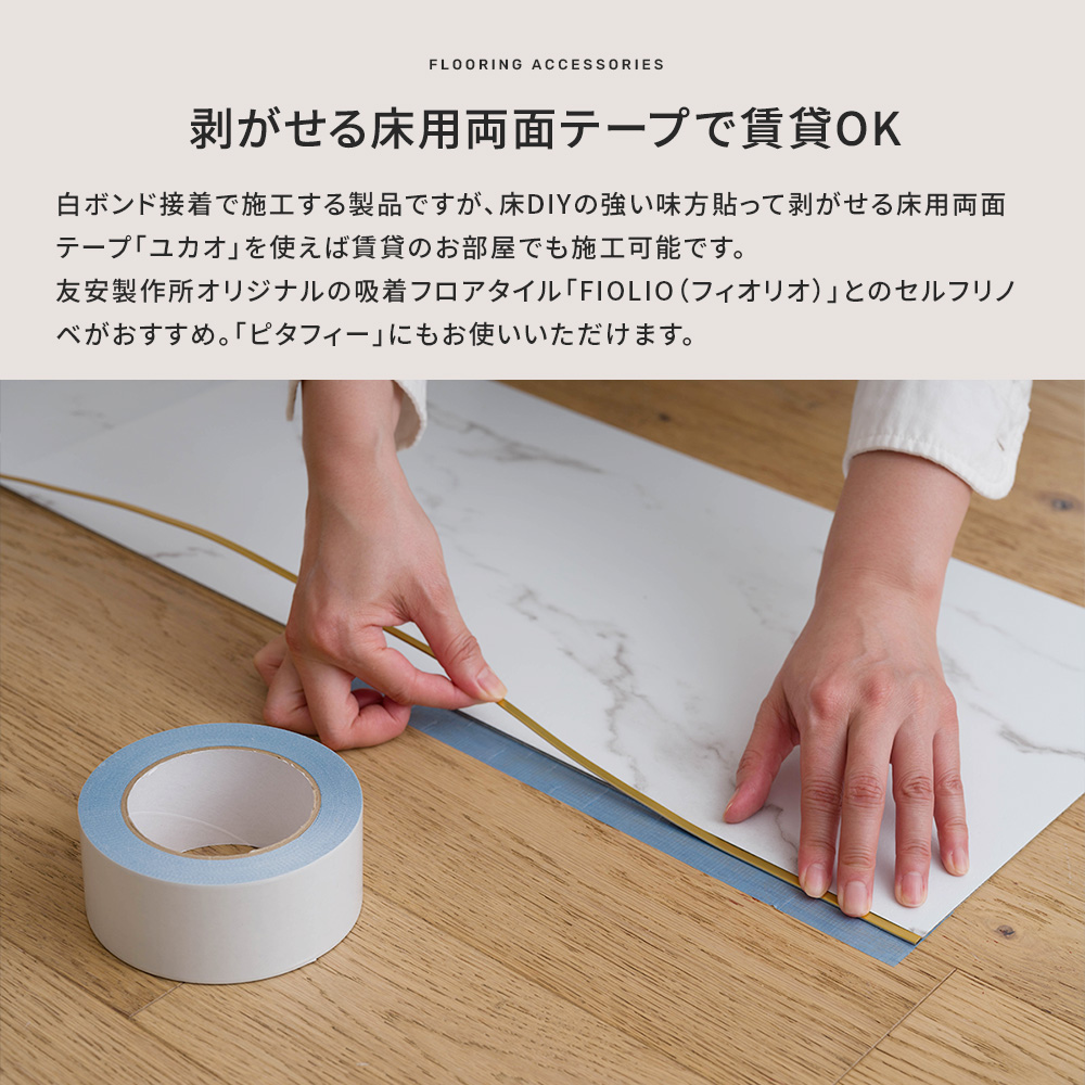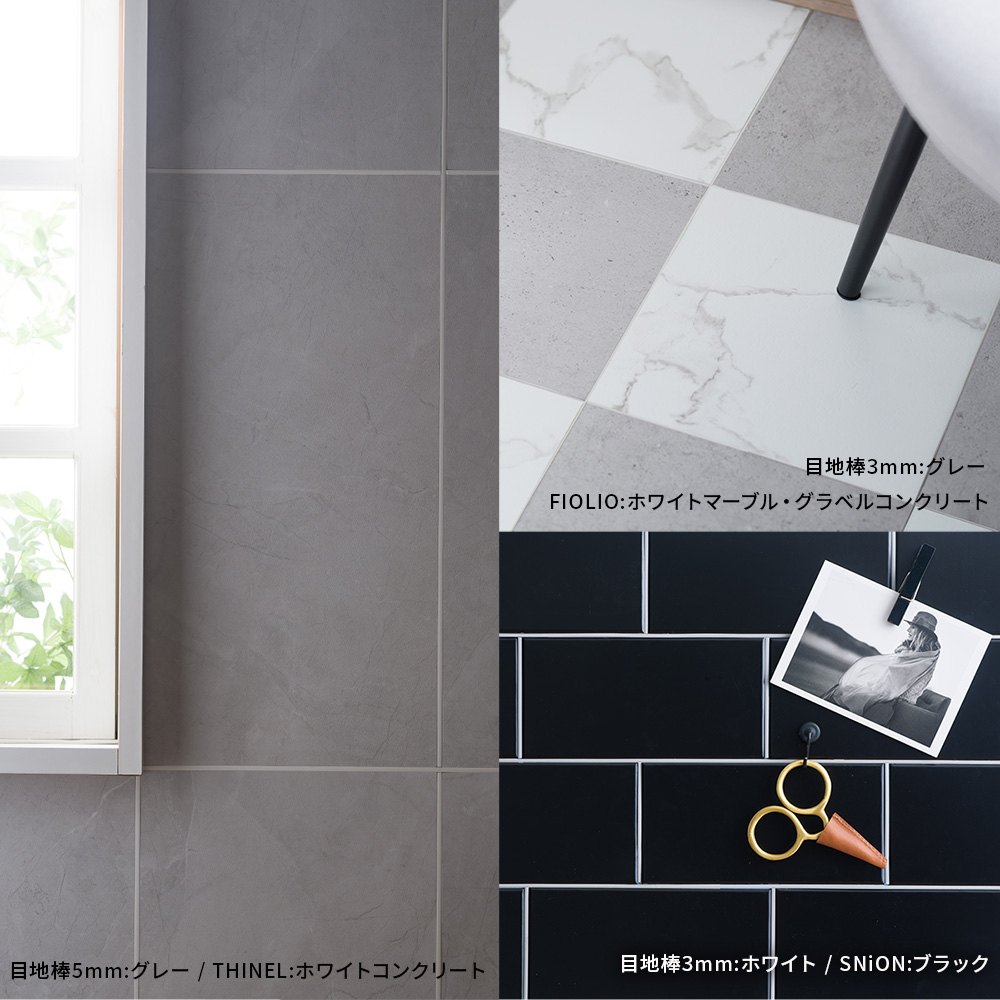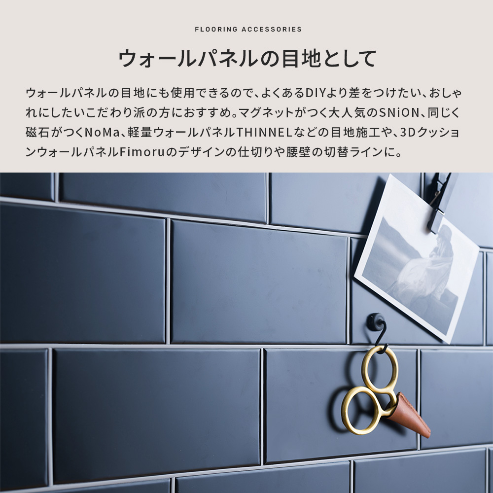 | フロアタイルの目地として、柄違いのフロアタイルのおしゃれな境界線として使用する目地棒。 キッチンとダイニングなど仕切りたいけど狭く見せたくない、間仕切りなどを置きたくない場所に施工すると空間を仕切ることができます。 床だけでなくウォールパネルの目地にも使用できるので、よくあるDIYより差をつけたい、おしゃれにしたいこだわり派の方におすすめ。 白ボンド接着で施工する製品ですが、床DIYの強い味方貼って剥がせる床用両面テープ「ユカオ」を使えば賃貸のお部屋でも施工可能です。 友安製作所オリジナルの吸着フロアタイル「FIOLIO(フィオリオ)」とのセルフリノベがおすすめ。「ピタフィー」にもお使いいただけます。 壁材ではマグネットがつく大人気の SNiON(シニオン)、同じく磁石がつく「NoMa(ノマ)」、軽量ウォールパネル THINNELなどの目地施工や、3Dクッションウォールパネル「Fimoru(フィモール)」のデザインの仕切りや腰壁の切替ラインに。 厚みは2mm厚のタイルからはみ出ない1.8mm厚。幅は細い3mmと、しっかり目地を目立たせる5mm幅の2種類。 タイル目地には3mm、空間や柄違いのタイルの仕切りには5mm幅がおすすめです。 メタリックのシルバーとゴールド、マットなホワイト、グレー、モカブラウン、ブラックの6色。 華やかなゴールドはどんなデザインのフロアタイルとも合わせやすくおしゃれになるのでイチオシカラーです。 送料のみの無料カットサンプルをご用意しておりますのでフロアタイルと合わせて色やサイズを実際に手に取ってお確かめください。 【カットサンプルはこちら】→ |