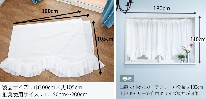 カーテン巾は300cmあるので、150cm〜200cm位の窓でご使用いただくと一般的な1.5倍〜2倍ひだ程度のギャザーになります。