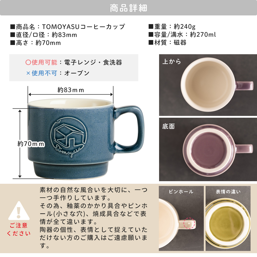 | ■商品名 TOMOYASUコーヒーカップ ■カラーバリエーション ピーチシャーベット、ドライリーフ、ミントグリーン、ラテブラウン、ジーンズブルー、キャラメリゼブラウン、オリーブ、ライラック、フォググレー ■サイズ 直径/口径:約83mm 高さ:約70mm ■容量 満水:約270ml ■重量:約240g ■素材:磁器 ■機能: オーブン × 電子レンジ 〇 食洗器 〇 ■生産国:日本(岐阜県) |