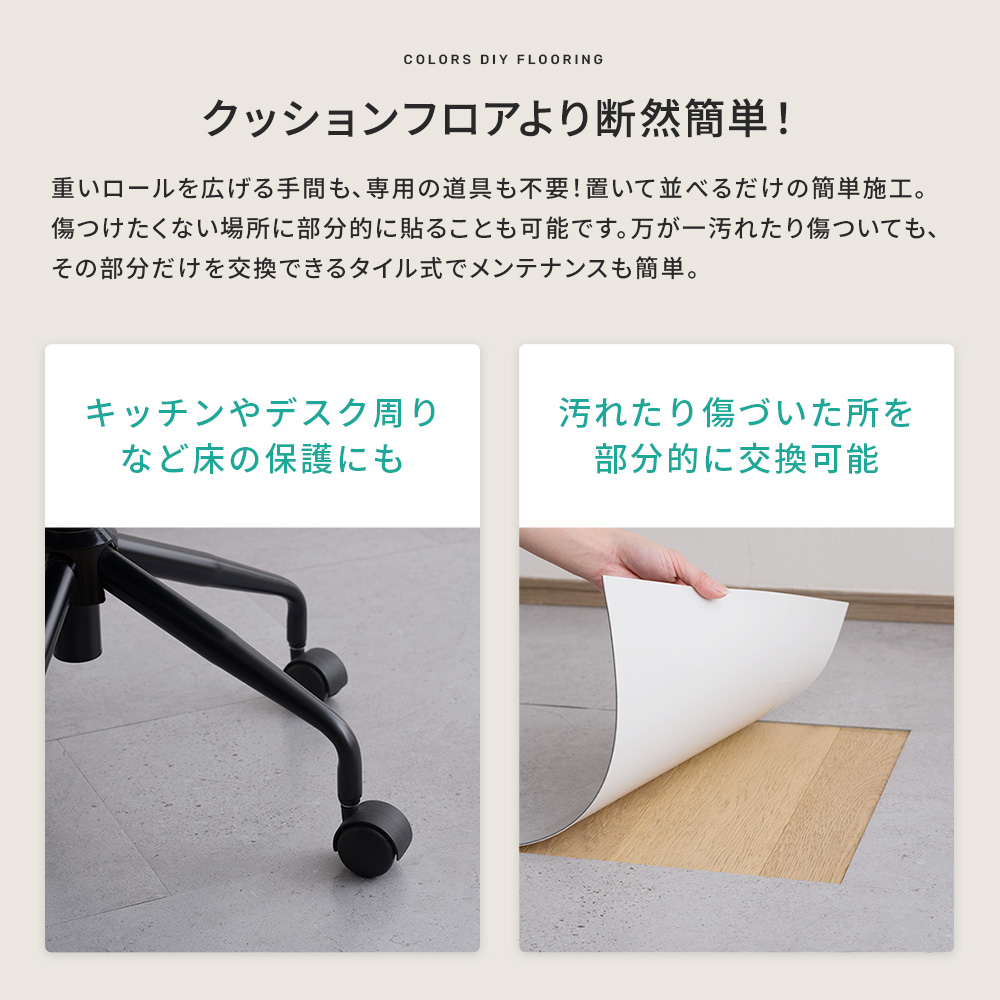 吸着でずれにくく、薄型でカットもらくらく、使いやすいタイルサイズでクッションフロアよりも簡単にセルフリノベーションができます。