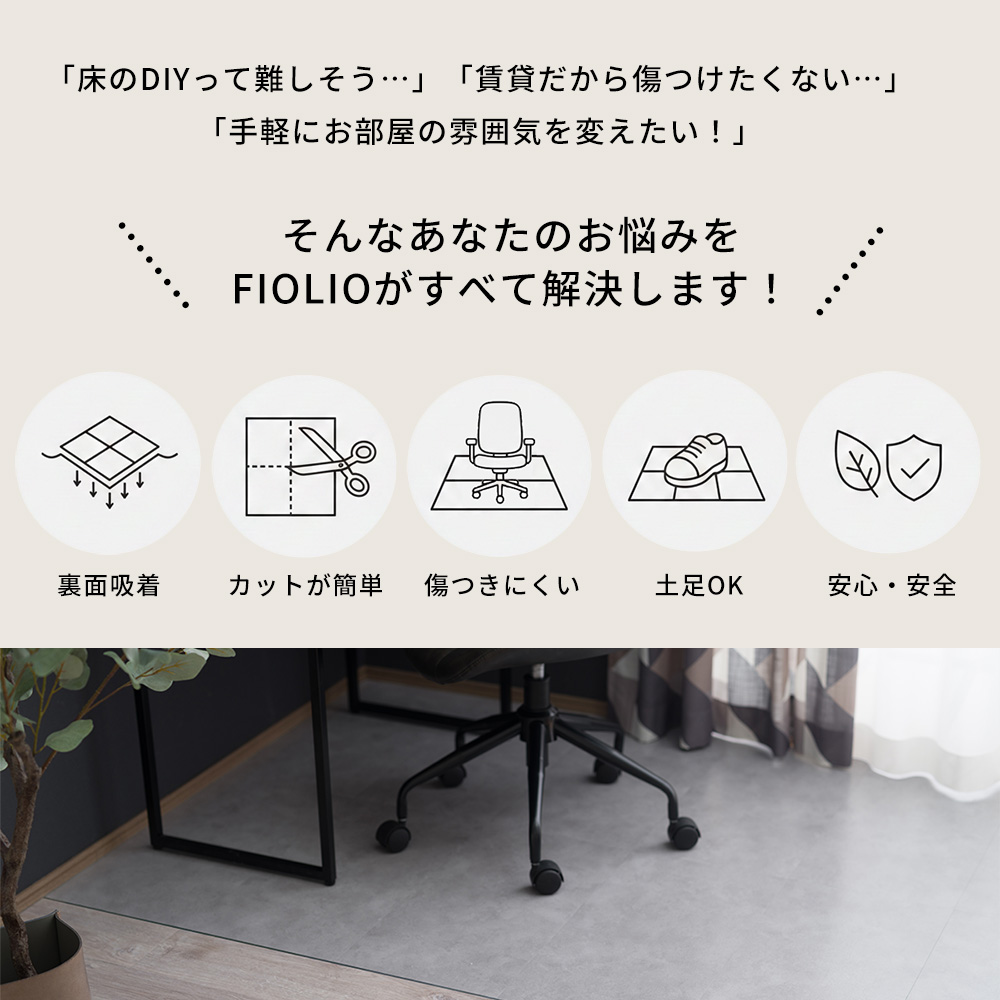 | ■商品名 吸着フロアタイル FIOLIO(フィオリオ) 1枚単品 ■デザイン 石目調、木目調 ■サイズ 152.4×152.4mm ■厚み 2mm ■カラー ホワイトマーブル、グレーモルタル、グラベルコンクリート、アッシュウッド、オークウッド ■材質 PVC、ウレタン ■重量 48g ■機能 防汚、抗菌、抗ウィルス、防カビ、耐水、耐摩耗(土足OK)、防滑 |