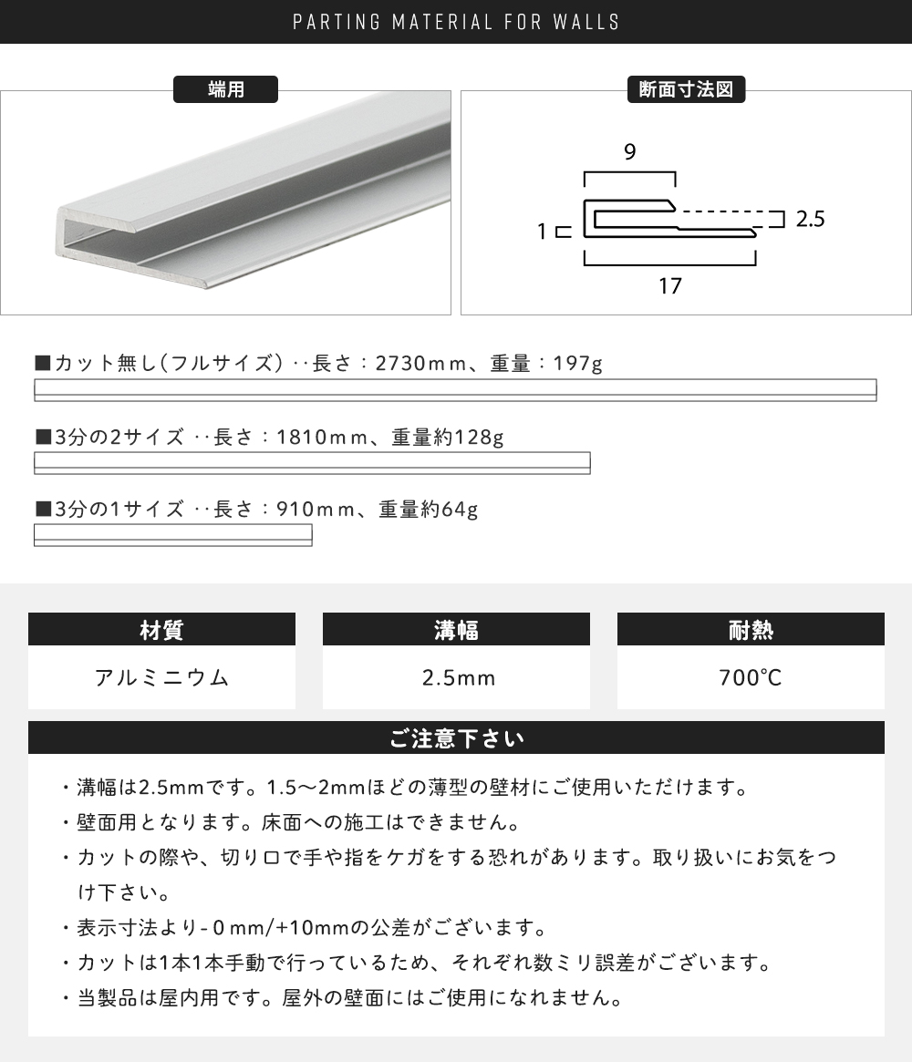 | ・溝幅は2.5mmです。1.5〜2mmほどの薄型の壁材にご使用いただけます。 ・壁面用となります。床面への施工はできません。 ・カットの際や、切り口で手や指をケガをする恐れがあります。取り扱いにお気をつけ下さい。 ・表示寸法より-0mm/+10mmの公差がございます。 ・カットは1本1本手動で行っているため、それぞれ数ミリ誤差がございます。 ・当製品は屋内用です。屋外の壁面にはご使用になれません。 |