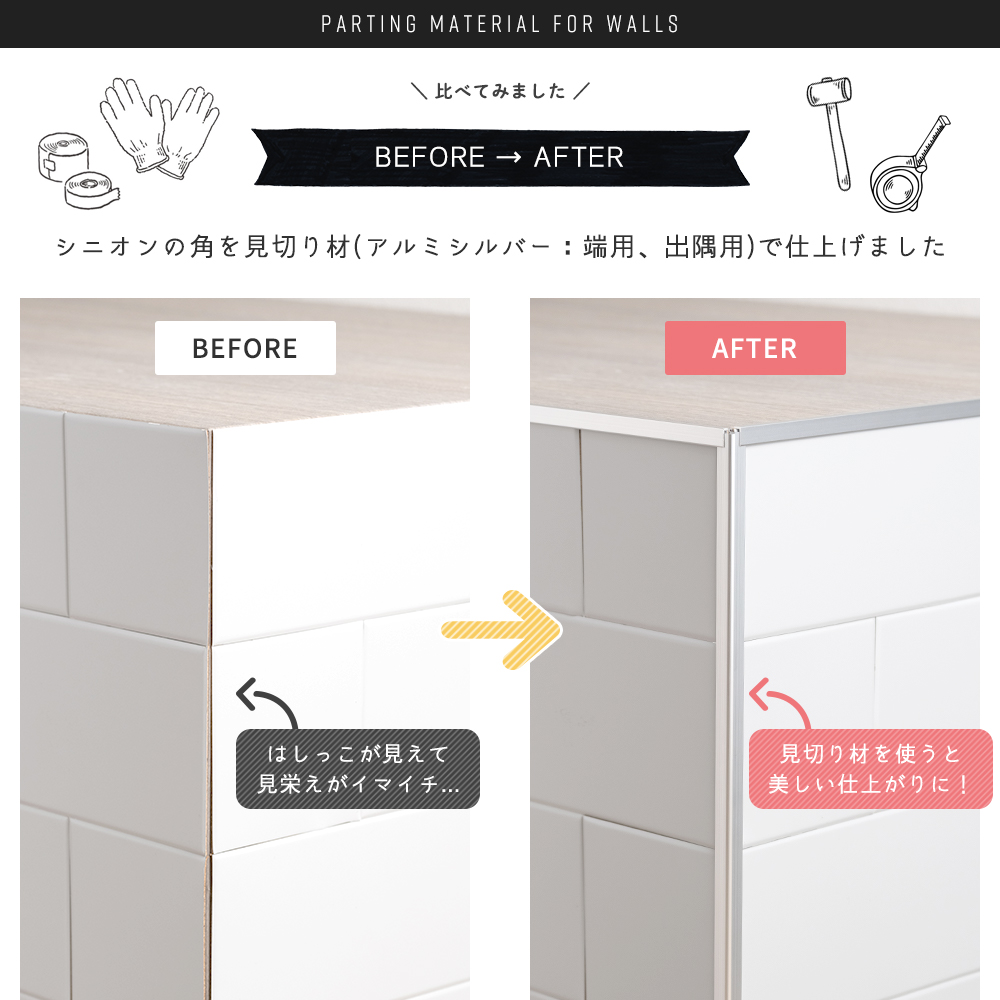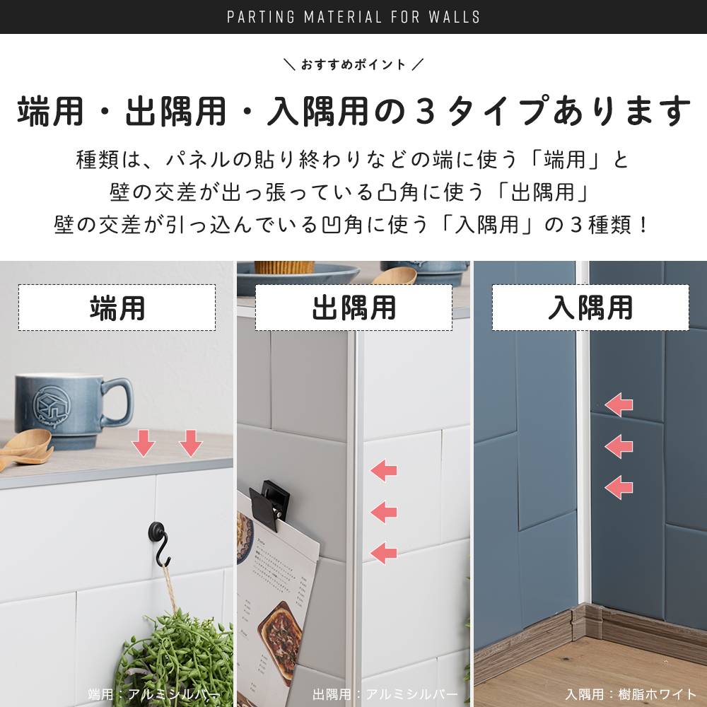 | 壁用パネル「シンネル」「シニオン」「ノマ」におすすめ! 綺麗に切るのが少し難しい切り口(小口)を隠す事ができる見切り材。 壁面の一部分に貼るなどでも見切り材で囲めばスッキリ綺麗に見せることができます。 ・端用は両端だけでなく、上下にも使える万能タイプ。 ・入隅用は施工の難しい角の内側に。 ・出隅用は柱などの出っ張り部分に。 どんなカラーも合わせやすいホワイトの樹脂素材と、メタリックカラーに合わせやすいシルバーのアルミ素材と2タイプあります。 アルミタイプは熱に強いのでコンロ周りや熱源の近くへの施工におすすめです。 水回りや室内などにはカットしやすくお値段もお手頃な樹脂素材のホワイトがおすすめ。 ※水回りへの施工は仕上げにクリアコーキングのご使用をおすすめします。 長さは3サイズあり、それぞれご注文ページが異なります。 こちらは「端用コ型/アルミシルバー/910mm」のページです。 →薄型壁パネル用見切り材の商品一覧はこちら →磁石がくっつくステンレスパネル「シニオン」の商品一覧はこちら →磁石がくっつく不燃パネル「ノマ」の商品一覧はこちら |
