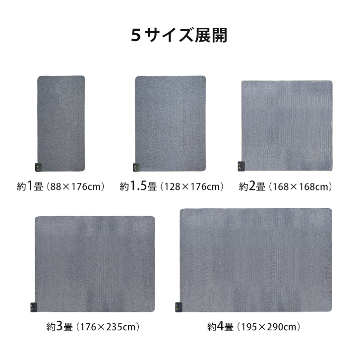 | (サイズ) 176×235cm (定格) 交流100V-50/60Hz (表面材質) ポリエステル100% (コード) ビニルキャブダイヤコード約1.4m (消費電力) 600W (温度調節目盛・強) 電気代 約13.6円/1時間、表面温度 約45度 (原産国) ベトナム製 ・ダニ退治機能 ・スライド式コントローラー ・切り忘れタイマー:8時間 ・暖房面切替機能:2面3通り ■届いてすぐに使える電気カーペット ■空気を汚さず、乾燥も少ないので、安心してご使用いただけます。 ■接着剤不使用で環境にやさしい、特許取得の「接結製法」。小さくたためて収納にも便利 |