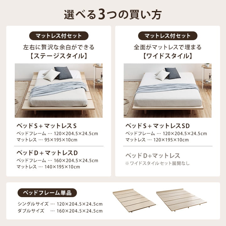 | ・ステージベッド ・ステージベッドダブル ・ステージベッド+マットレスシングルセット ・ステージベッド+マットレスセミダブルセット ・ステージベッド+マットレスダブルセット ・ステージベッド+夢見畳シングルセット ・ステージベッド+夢見畳セミダブルセット ・ステージベッド+夢見畳ダブルセット |