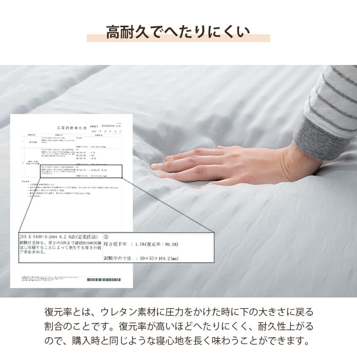 | 【ベッド】フレーム=プリント紙化粧繊維板 脚=天然木 【マットレス】側生地=ポリエステル100%(ピーチスキン) 中材=高反発ウレタンフォーム 25D 190N 10cm(プロファイル) |