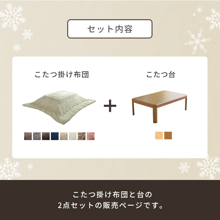 | ■ 大人気のフランシリーズの厚掛けこたつ2点セットです!! ■ 中わたに抗菌防臭加工を施しました。 ■ 側地には柔らかく、肌触りの良いフランネル生地を使用してます。毛足が短いのでゴミや埃が絡みにくいという特長もあります。 ■ 掛布団は、両面使用可能なリバーシブルタイプです。 ■ こたつ台は、高級感のある家具調こたつ台です。 ■ 高さを調節できる継ぎ脚付き。 ■ 中間電源スイッチやコードフック等、あると便利な機能付き。 こたつの特長として 1.省エネルギー、こたつは必要なところだけを暖める省エネルギー暖房器具です。 2.クリーン、こたつは二酸化炭素など有害物質を出さないのでクリーンです。 3.団らんの場、家族や友達が一緒にくつろげる空間、心も体もポッカポカになります。 ※ こたつ敷き布団は別売りです。 ※ 付属の取り扱い説明書を必ずお読みの上ご使用ください。 ※ 本商品は圧縮梱包でのお届けとなります。商品開封後は一切返品を承ることができませんので、あらかじめご了承ください。 ※ こちらの電化製品につきまして、商品の特性上ご注文後の返品・交換はお受け致しかねます。あらかじめご了承ください。 ※ この製品は海外ではご使用になれません。変圧器をご使用いただいた場合でもご使用になれません。 ※ 掲載写真は表記サイズと異なる場合がございます。 ※ こたつ布団は生産時期により、同色の場合でも若干の色の差が生じることがございます。あらかじめご了承ください。 ※ 画面上のカラーはご使用ブラウザやモニターの設定により、実物とは若干異なる場合がございます。あらかじめご了承の上、ご注文をお願いいたします。 |